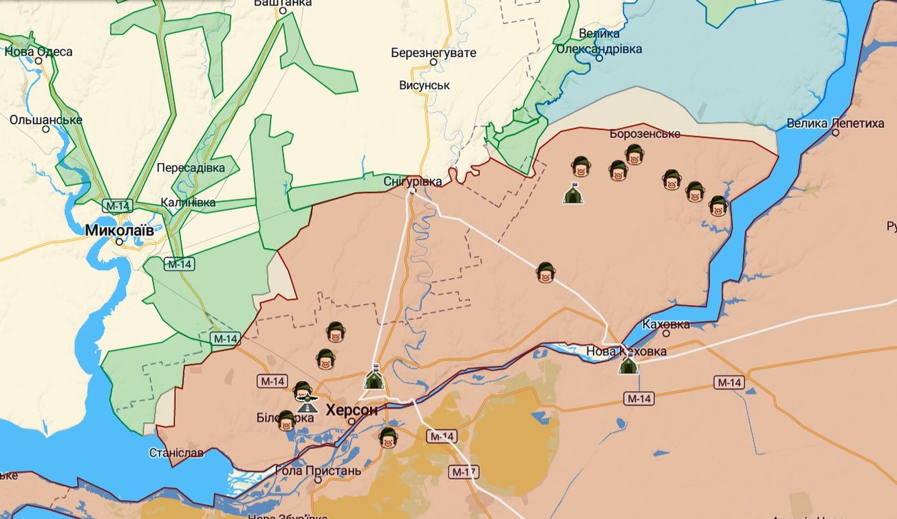 Теоретично буде достатньо прорвати фронт в напрямку Берислава, а далі Херсона та Снігурівки й до Херсона, щоб заблокувати всі переправи, в т.ч. Антонівський міст і тоді частина російських військ буде заблокована та притиснута до Дніпра. Ширина фронту на правому березі Дніпра зараз близько 130 км.